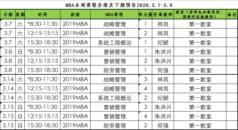 MBA本周课程安排及下期预告2020.3.7-3.8