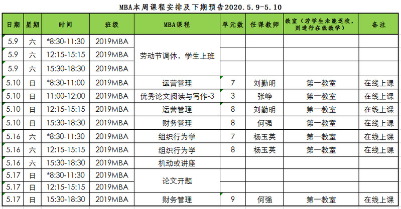 MBA本周课程安排及下期预告2020.5.9-5.10