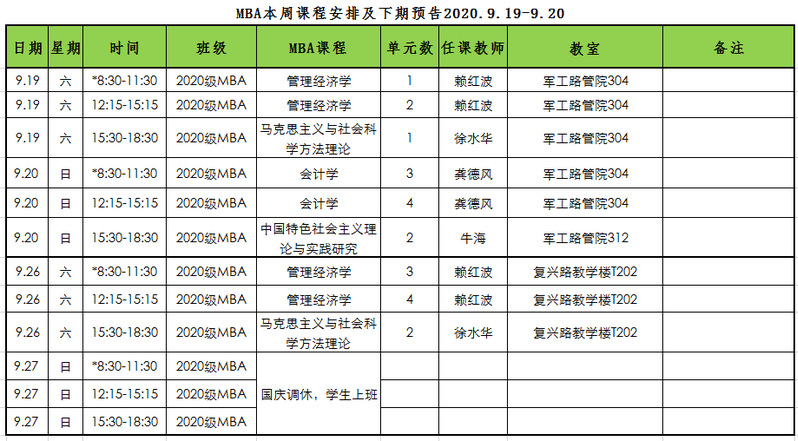 MBA本周课程安排及下期预告2020.9.19-9.20