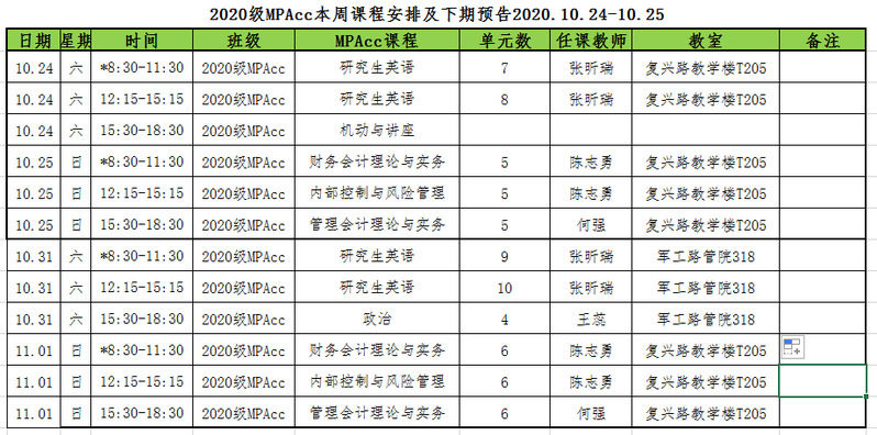 2020级MPAcc本周课程安排及下期预告2020.10.24-10.25