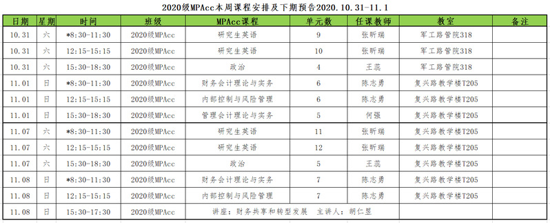 2020级MPAcc本周课程安排及下期预告2020.10.31-11.01