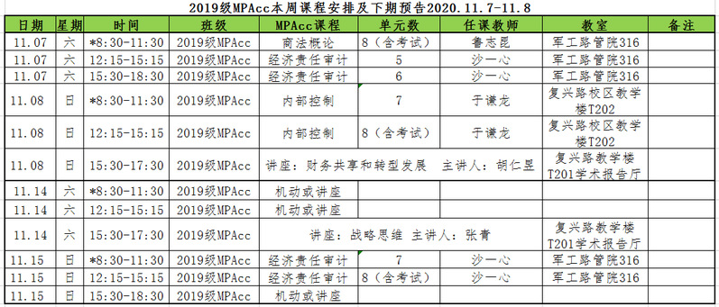 2019级MPAcc本周课程安排及下期预告2020.11.7-11.8