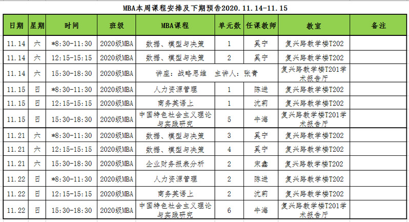 MBA本周课程安排及下期预告2020.11.14-11.15