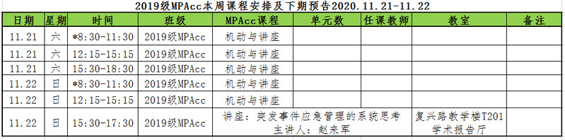 2019级MPAcc本周课程安排及下期预告2020.11.21-11.22
