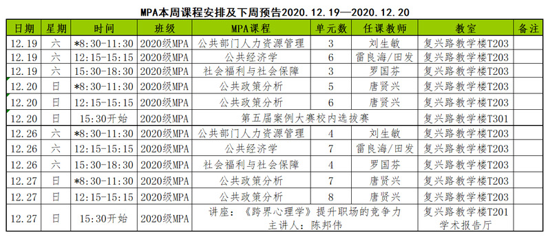 MPA本周课程安排及下周预告2020.12.19—2020.12.20