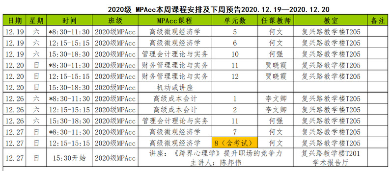 2020级 MPAcc本周课程安排及下周预告2020.12.19—2020.12.20