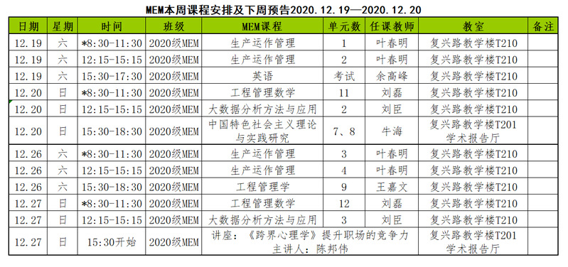 MEM本周课程安排及下周预告2020.12.19—2020.12.20