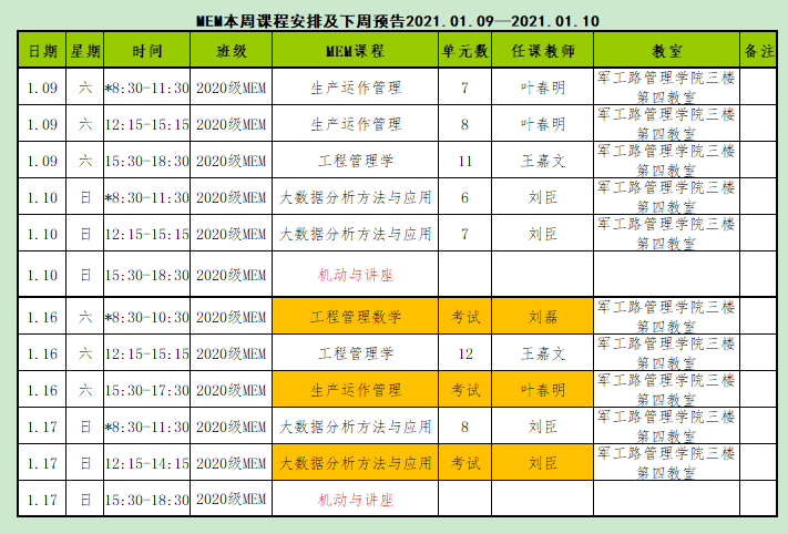 MEM本周课程安排及下周预告2021.01.09—2021.01.10