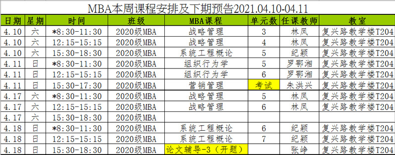 MBA本周课程安排及下期预告2021.04.10-04.11
