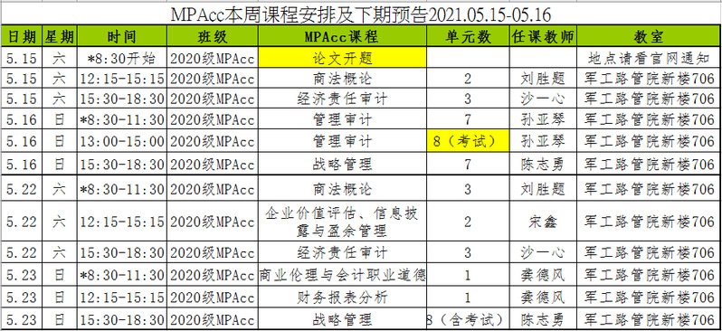 MPAcc本周课程安排及下期预告2021.05.15-05.16