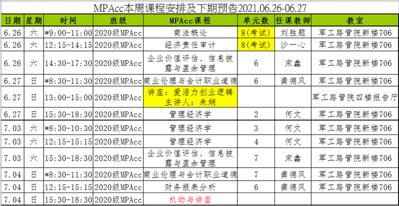MPAcc本周课程安排及下期预告2021.06.26-06.27