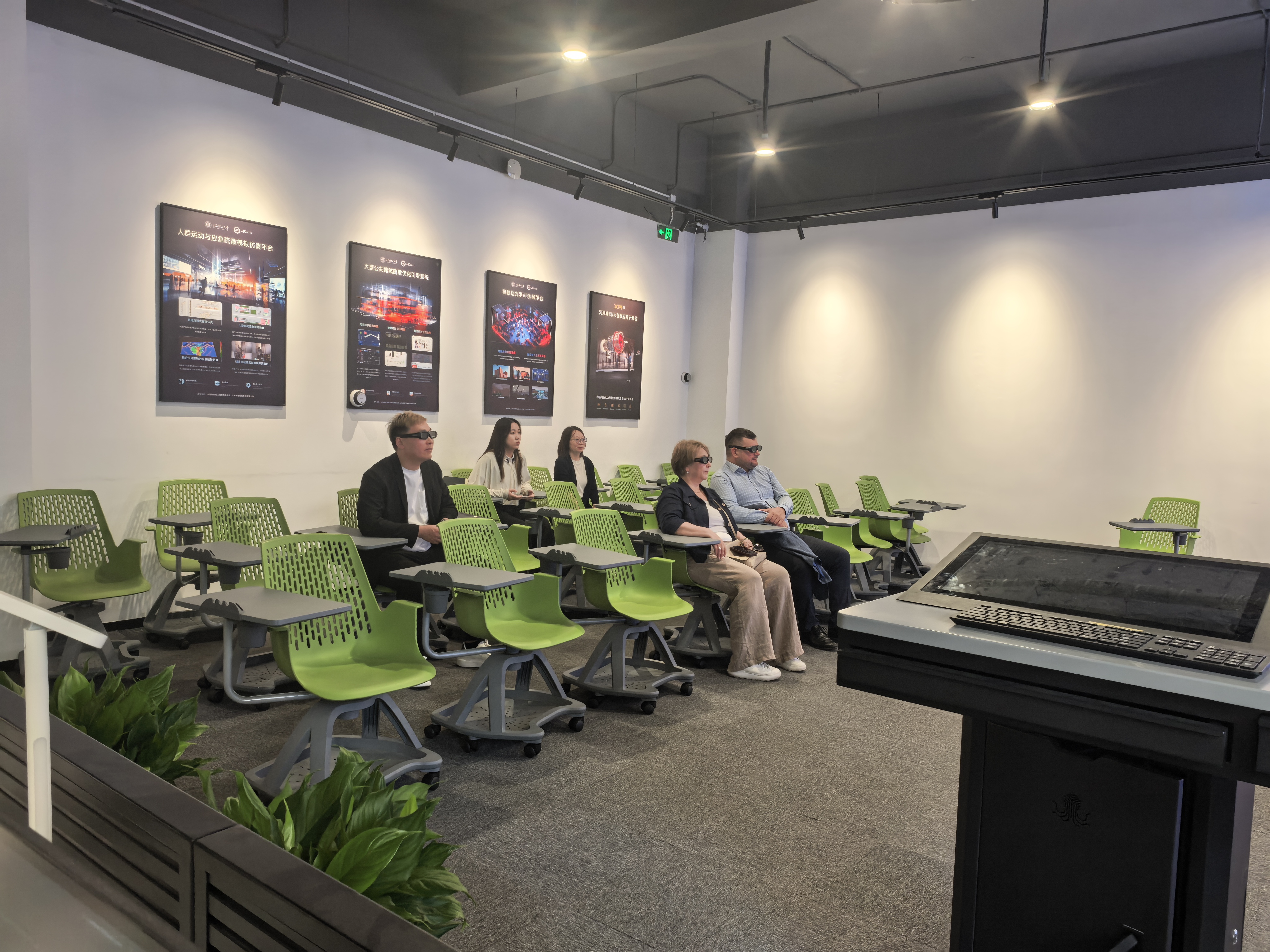 德米特里·吉洪诺夫一行还参观了智慧应急管理实验室,体验了VR实验平台,以及3D LED大屏的视觉沉浸+触觉反馈的融合交互虚拟仿真环境。