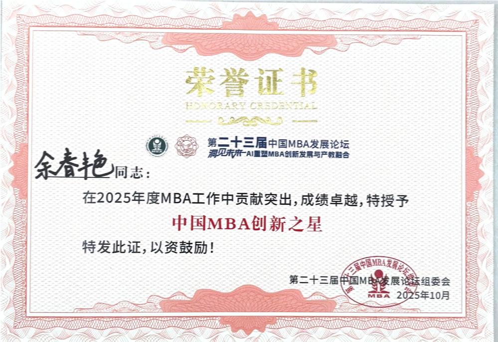 上理管院专业学位教育中心综合办公室主任孟陈莉荣获“2025年度中国MBA培养院校领航奖”;上海理工大学MBA联合会获“2025年度中国MBA社群建设奖”;联合会——“迎春杯”系列体育赛事被评为“2025年度中国MBA优秀文体活动”;2024级MBA在校生汤宗鑫、赵静获评“2025年度中国MBA新秀100”;2025届MBA校友余春艳被评为“2025年度中国MBA创新之星”。