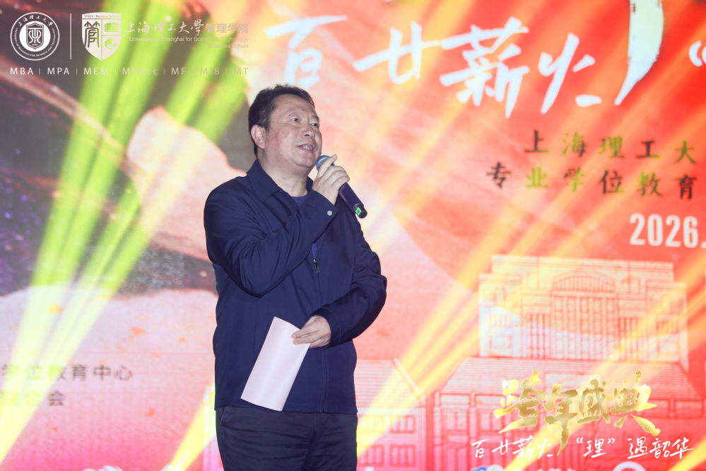 1月10日晚,上海理工大学管理学院专业学位教育中心“百廿薪火 ‘理’遇韶华”2026跨年盛典在军工路校区大礼堂举行。管理学院院长、专业学位教育中心主任赵来军,管理学院党委书记马静波,校体育教学部主任朱晓菱,校研究生工作部副部长、研究生院副院长王张琦,管理学院副院长房志明、刘魏巍,MPA项目主任车丽萍,MEM项目主任叶春明,MF项目主任高广阔,专业学位教育中心综合办公室主任孟陈莉,上海管理教育学会MBA专委会主任、上海MBA联谊会理事长吕俊等出席活动。管理学院师生代表、上海相关高校MBA(专硕)联合会主席团代表等一同观看了演出。
