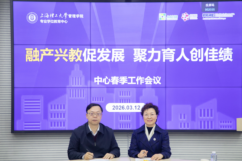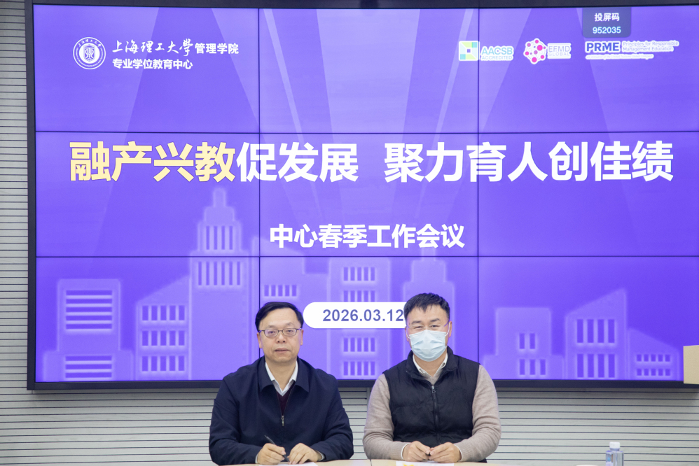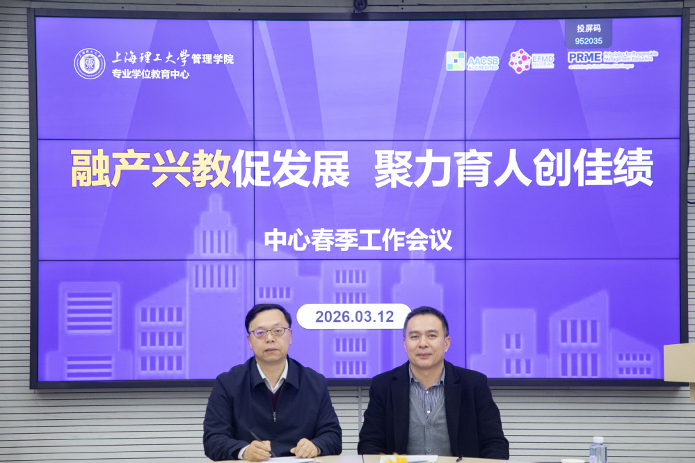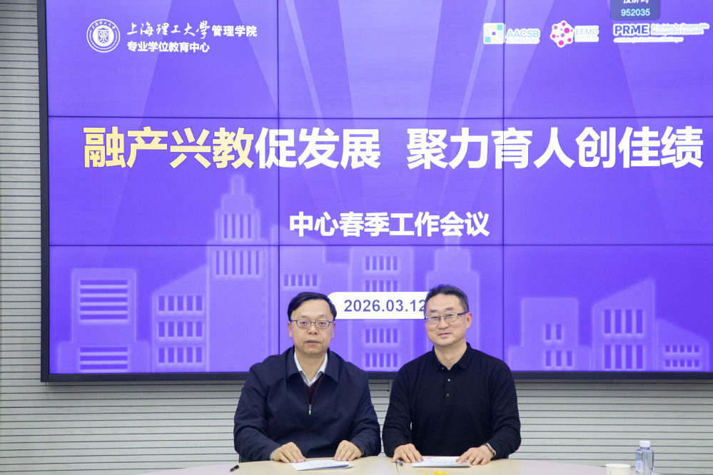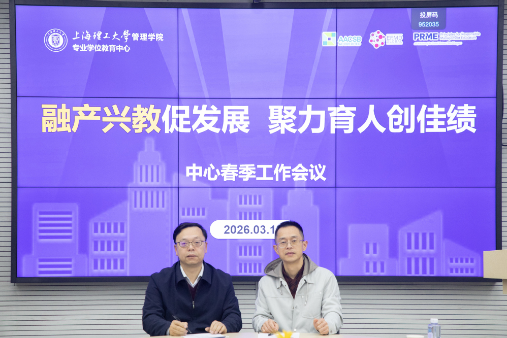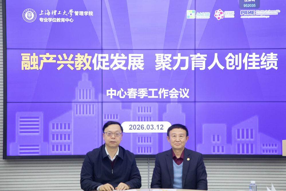 为深入贯彻学校高等教育综合改革精神,全面提升专业学位研究生培养质量,3月12日下午,上海理工大学管理学院专业学位教育中心召开以“融产兴教促发展,聚力育人创佳绩”为主题的2026年春季工作会议。管理学院院长、专业学位教育中心主任赵来军,学院党委书记马静波出席会议。会议由副院长刘魏巍主持。MBA项目主任张峥、MPA项目主任车丽萍、MEM项目主任叶春明、MPAcc项目副主任于谦龙、MF项目主任高广阔、MIB项目主任秦炳涛、MT项目主任田发、中心综合办公室主任孟陈莉及中心全体行政管理人员参加会议。