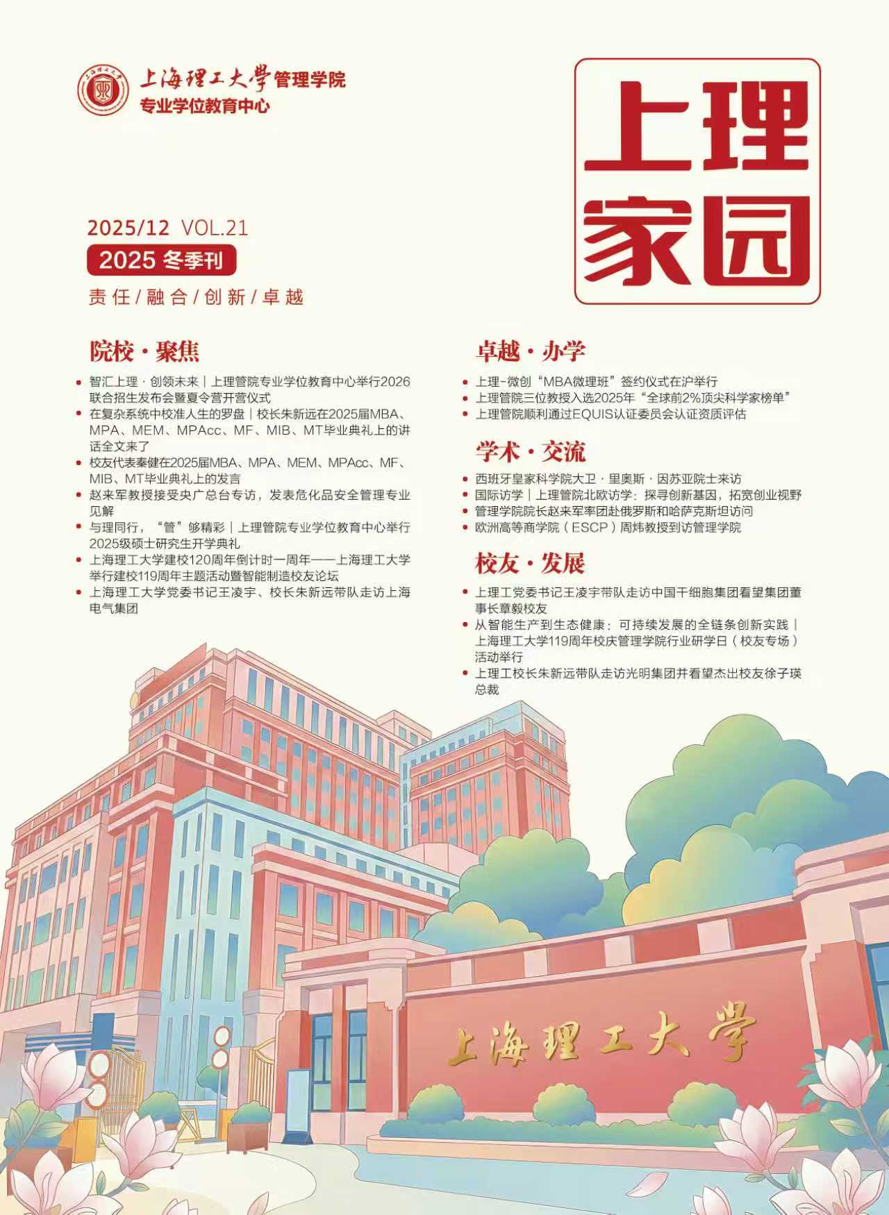 《上理家园》已创刊十几年,是一本面向上海理工大学管理学院校友发行的刊物。多年来已经成为校友和母校之间交流互动的一个有效平台,丰富了校友们的精神生活,更增强了大家“信义勤爱,思学志远”的荣誉感和责任感。该刊2023年全面升级改版,栏目多样内容丰富。我们对长期来,一直关心和支持刊物的大校友们深表感谢。